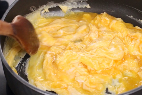 Bắc chảo lên bếp, để lửa vừa, cho dầu ăn vào để nóng già rồi đổ trứng vào bác đến khi trứng dẻo kết lại thành bánh thì tắt bếp để qua một bên (không để trứng chín quá sẽ khô và tơi ra mất).