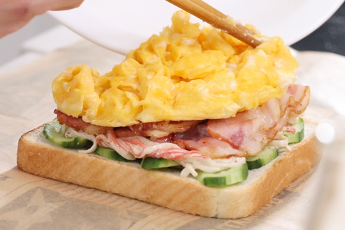 1. Bánh sandwich thịt xông khói: phết phô mai lên 2 lát bánh mì, rồi xếp lần lượt lớp dưa chuột, surimi và sốt bơ vừng, thịt xông khói, trứng bác, rau bắp cải ở giữa. Dùng giấy bọc thực phẩm bọc bánh sandwich lại. Khi ăn bạn cắt chéo.