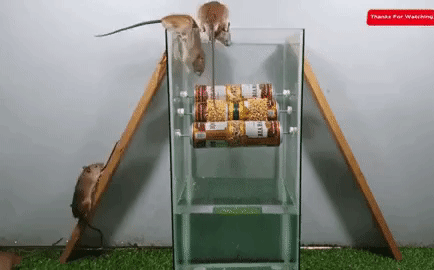 Dùng các tấm gỗ bắc thang lên trên bể cá sao cho chuột dễ leo lên giống như trong hình. Chuột đói sẽ bò lên để ăn thóc, và sẽ bị trượt ngã xuống bể cá, vì những lon bia bây giờ chẳng khác nào những chiếc bánh xe tử thần cả.
