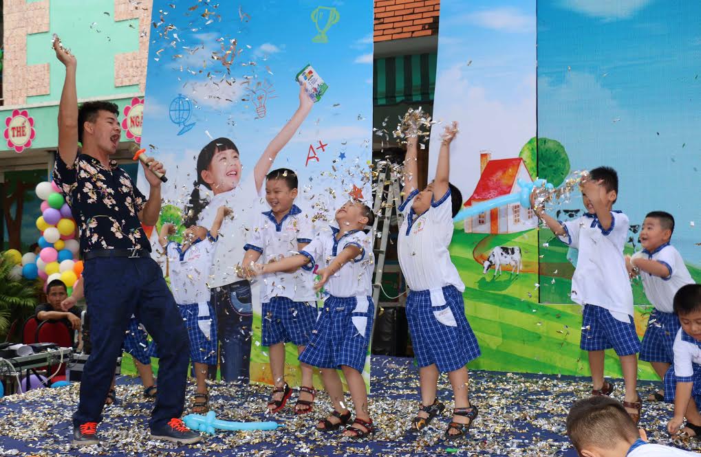 | Các bé trường mầm non An Bình, Biên Hòa đang cùng nhau tham gia các trò chơi vui nhộn cùng nghệ sĩ hài Xuân Bắc trong ngày hội sữa học đường do Vinamilk và Tetra Pak tổ chức |
