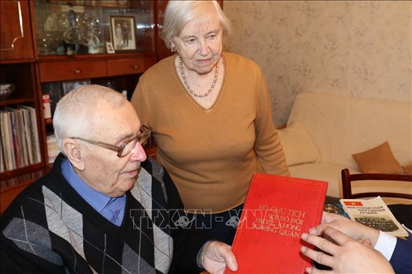 Ông bà Ivashko giới thiệu cuốn sách quý về Hồ Chủ tịch. Ảnh: Hồng Quân/TTXVN |