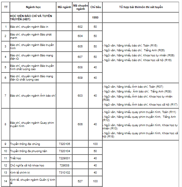 Dưới đây là bảng mã ngành đào tạo và chỉ tiêu Học viện Báo chí và Tuyên truyền năm 2019: