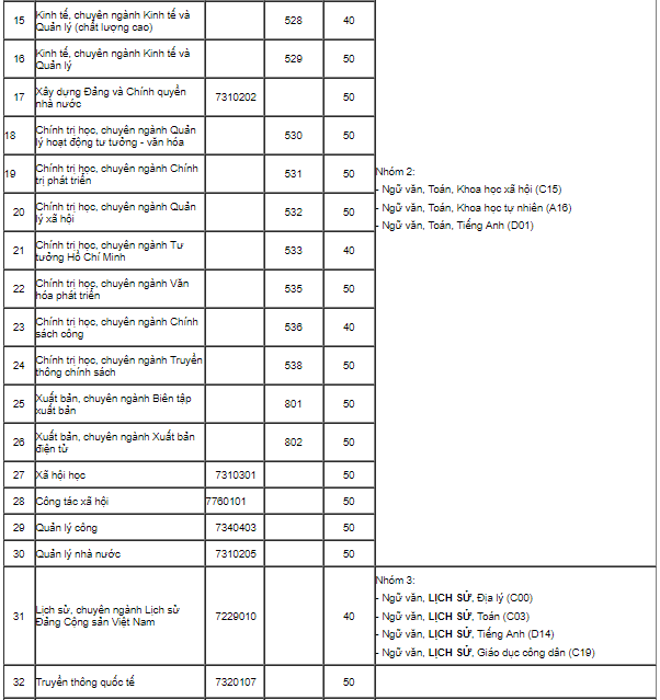 - Nhóm 2 gồm các ngành: Truyền thông đại chúng, Truyền thông đa phương tiện, Triết học, Chủ nghĩa xã hội khoa học, Kinh tế chính trị, Kinh tế, Xây dựng Đảng và Chính quyền nhà nước, Chính trị học, Xuất bản, Xã hội học, Công tác xã hội, Quản lý công, Quản lý nhà nước;