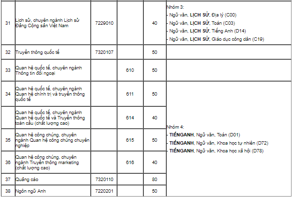 - Nhóm 4 gồm các ngành: Truyền thông quốc tế, Quan hệ quốc tế, Quan hệ công chúng, Quảng cáo, Ngôn ngữ Anh.