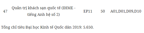 Mã trường Đại học Kinh tế Quốc dân năm 2019 là KHA. Năm nay, tổng chỉ tiêu vào trường Đại học Kinh tế Quốc dân là 5.650 thí sinh.