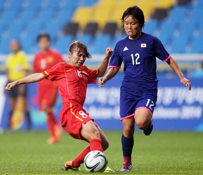 | Nguyễn Thị Liễu (8) tranh bóng với cầu thủ Nhật Bản tại ASIAD 14. |