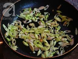 - Bắc chảo lên bếp, chờ chảo nóng, cho dầu ăn vào. Trút sả, ớt, tỏi vào phi cho vàng đều. Nếu thích ăn cay có thể cho thêm 1 muỗng sa tế.