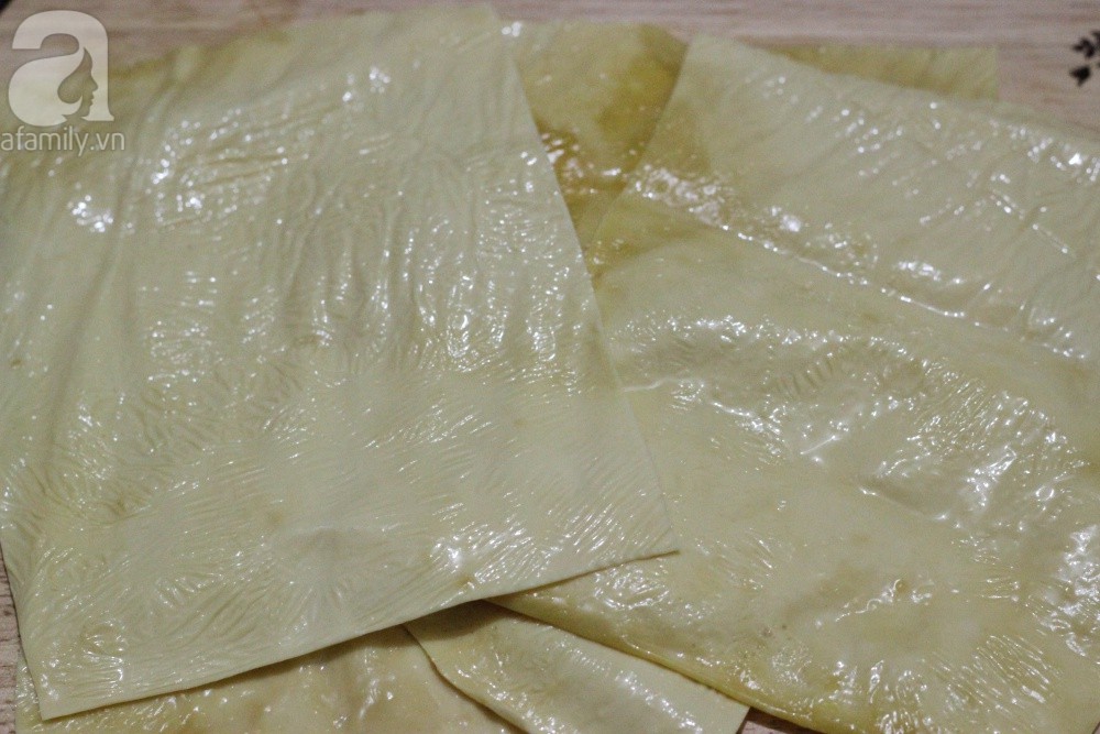 Bước 5: Váng đậu rửa sạch, cắt miếng nhỏ, kích thước tùy thuộc vào bạn muốn gói nem to hay nhỏ.
