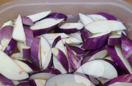 Bước đầu tiên, bạn cắt bỏ cuống cà tím rồi bổ thành 6 miếng vừa ăn. Sau đó, ngâm cà vào bát nước chứa muối loãng hoặc dấm để cà ra bớt nhựa. Bạn ngâm như vậy trong khoảng 15 - 20 phút.