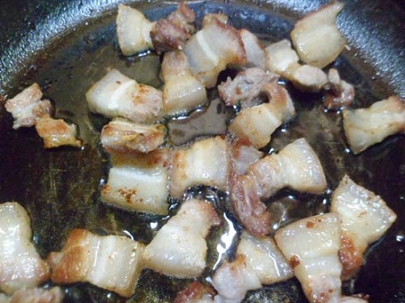 Bây giờ, bạn làm sạch thịt ba chỉ, thái miếng rồi cho vào chảo rán cho bớt mỡ. Sau đó, dùng một nồi khác phi thơm chút hành ở một rồi cho thịt vào xào cùng, nêm gia vị cho vừa miệng rồi cho bát nước lọc om đến khi nhừ.