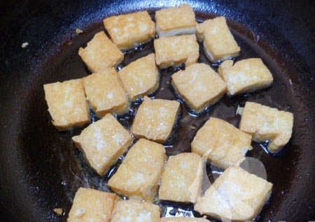Bước tiếp theo của cách nấu cà bung là bạn thái miếng đậu phụ vừa ăn rồi mang chiên bằng chỗ mỡ vừa rán thịt. Bạn không nên rán đậu kỹ quá kẻo mất vị béo, mềm của đậu.