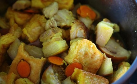 Sau khi thịt nhừ, bạn cho đậu phụ đã chiên vào nồi thịt rồi thái nghệ giã ra lọc lấy nước màu và cho vào nồi đậu thịt đun sôi.