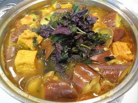 Cà bung nấu thịt ba chỉ là món ăn dân dã, quen thuộc với người dân miền Bắc. Đặc trưng của món ăn này là hương thơm dịu nhẹ của lá tía tô kết hợp với vị chua của mẻ, kết hợp với đậu phụ, thịt ba chỉ vô cùng hấp dẫn.