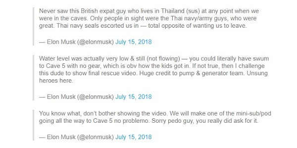 Thậm chí, doanh nhân Mỹ được mệnh danh là "thiên tài công nghệ" này còn dùng từ "pedo guy" ("pedo" là viết tắt của chữ "pedophile", chỉ người có ham muốn tình dục với trẻ em) để gán cho thợ lặn người Anh.