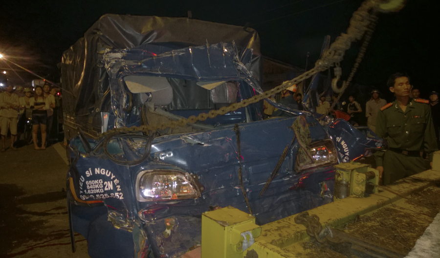 Cú tông mạnh khiến đầu xe tải chở rau bẹp dúm, chị C. chết tại chỗ còn anh Ng. cùng con trai tử vong trên đường tới bệnh viện. Thùng xe tải đông lạnh cũng bị bể nát, hư hỏng nặng.