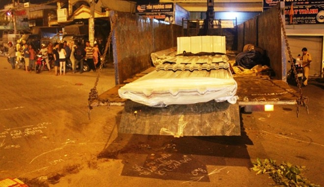 Sau cú va chạm, nam thanh niên này bị những tấm tôn cắt đứt cổ, tử vong tại hiện trường. Chiếc xe máy của nạn nhân chạy tiếp khoảng 20 m mới ngã ra đường.