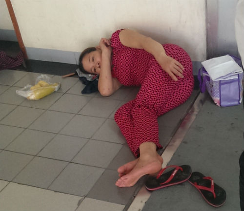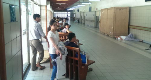 Thời tiết nắng nóng, lượng người đông đúc khiến mọi người thêm phần mệt mỏi hơn. Người nhà bệnh nhân ngồi la liệt khắp các hành lang, bóng râm trong bệnh viện.