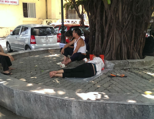 Trưa ngày 29/5, ghi nhận của PV báo Đời sống & Pháp luật, trong khuôn viên bệnh viện Bạch Mai (Hà Nội) rất đông người nhà bệnh nhân vạ vật dưới bóng cây, bên ghế đá nằm nghỉ. Thời tiết nắng nóng lên tới 39 độ C khiến ai cũng mệt mỏi và khó chịu.