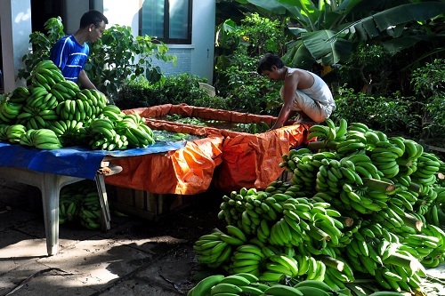 Thương lái Trung Quốc thu mua chuối lùn (không non, không già) tính cân theo từng buồng. |