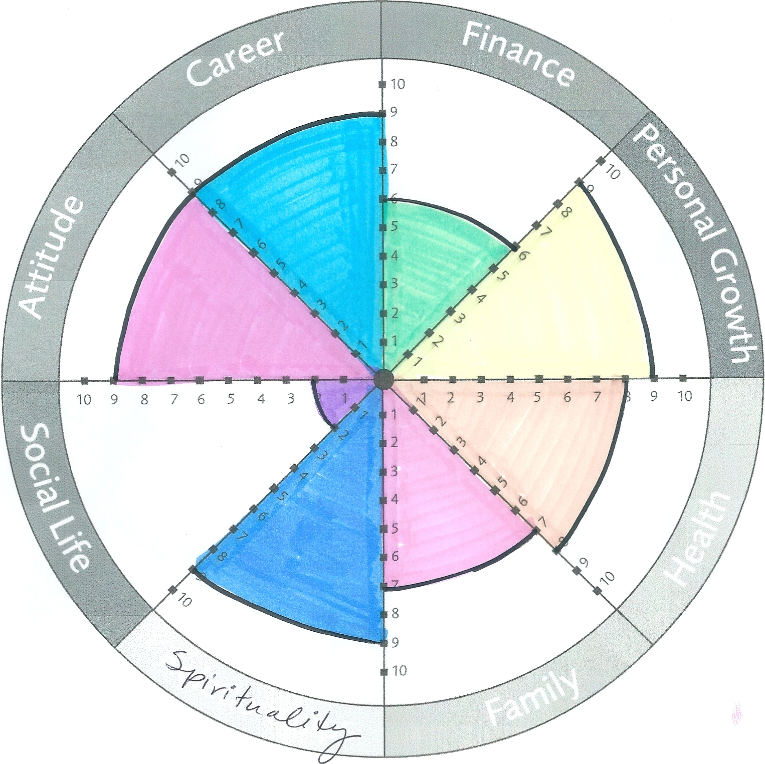 Bước 1: Vẽ Bánh Xe Cuộc Đời, chọn ra những lĩnh vực quan trọng trong cuộc sống của bạn và tự cho điểm nó (hãy thành thật với chính mình thì bạn mới có một cái nhìn đúng đắn về cuộc đời của mình được)