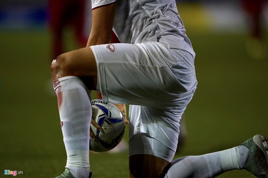 Cận cảnh chiếc đầu gối trái trầy xước, chảy máu thấm cả vào tất của Văn Hậu. Ảnh: Tri thức trực tuyến |