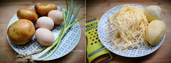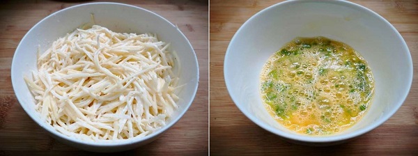 - Bước 1: Khoai tây gọt vỏ, rửa sạch sau đó bào thành sợi.