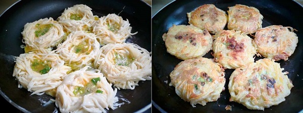 - Bước 4: Đun nóng lượng dầu ăn thích hợp trong chảo, múc từng muỗng khoai tây vào chảo, tạo thành hình dạng tổ chim. Múc một ít trứng đã đánh tan vào giữa từng chiếc bánh. Chiên cho bánh chín vàng đều hai mặt là được.