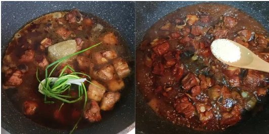 - Bước 4: Thêm lượng nước nóng vào ngập mặt sườn, tiếp đó cho hành lá vào rồi chuyển nhỏ lửa, đun khoảng 1 giờ cho đến khi sườn nhừ hoàn toàn và nước trong chảo cạn là được. Thêm chút bột nêm vào đảo đều cho ngấm gia vị rồi tắt bếp.