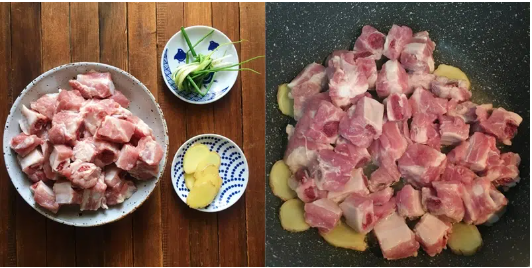 - Bước 1: Sườn rửa sạch, chặt thành miếng vừa ăn. Gừng thái lát, hành lá rửa sạch rồi cuộn lại. Đun nóng chút dầu ăn trong chảo sâu lòng, cho gừng vào xào thơm sau đó đổ sườn vào đảo đều.