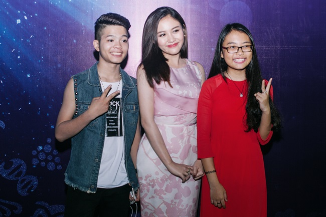 Văn Mai Hương xì tin chụp hình cùng Quang Anh The Voice Kids. |