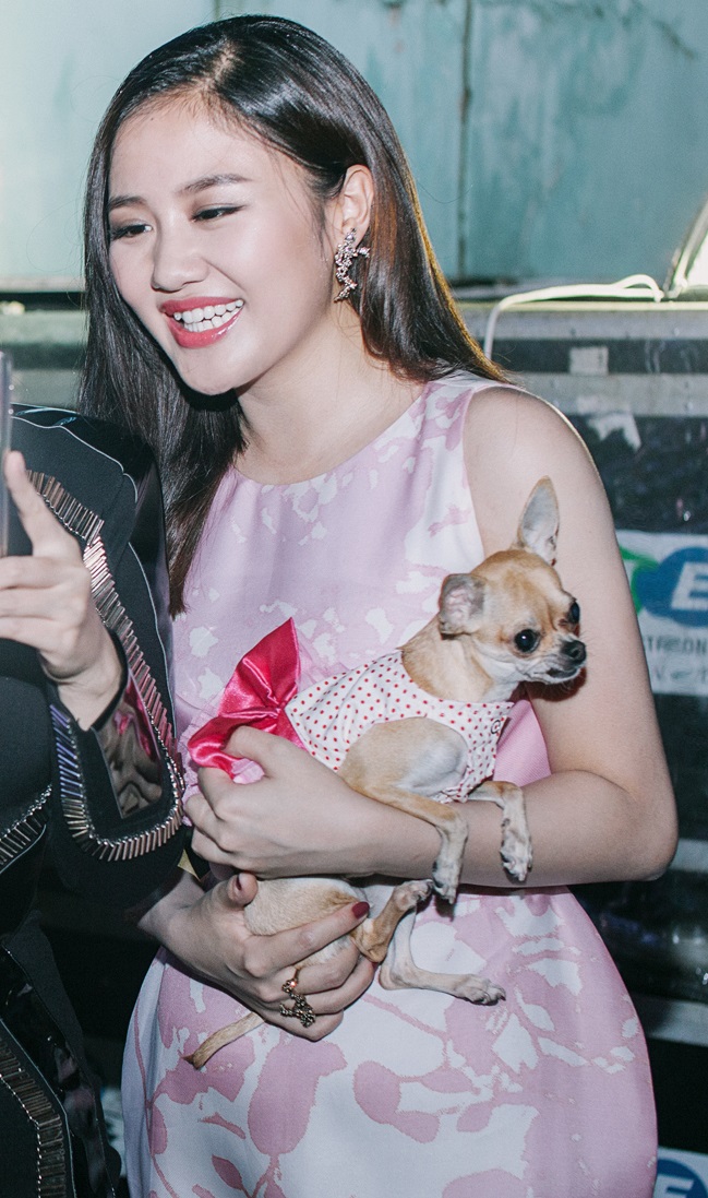| Trong hậu trường cô vui vẻ chụp hình cùng đàn chị Thu Minh, trên tay là chú cún Coco đáng yêu. |