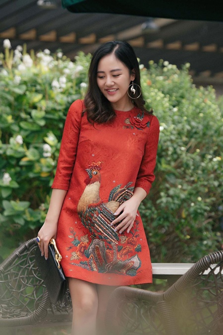 | Điểm nhấn chính trong những bộ trang phục của Văn Mai Hương đó chính là tông màu đỏ tươi mới cùng họa tiết thêu tay đại kê (gà trống) – biểu tượng của năm Đinh Dậu sắp đến. |