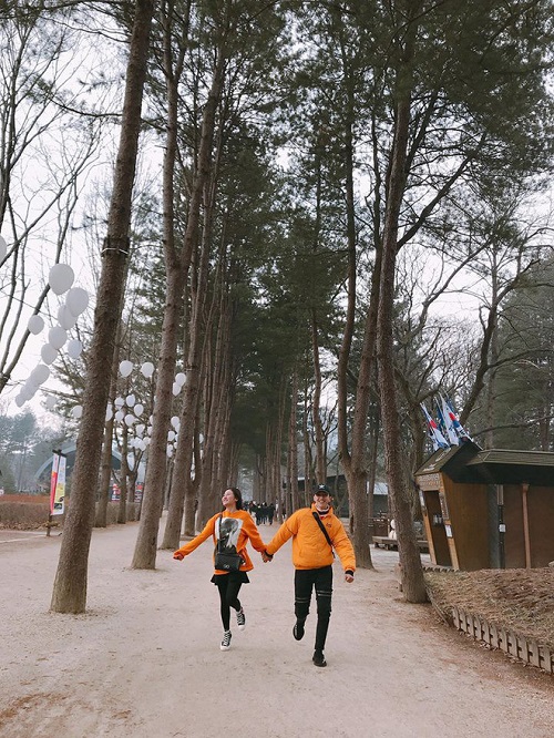 Văn Mai Hương và Bình An cùng mặc áo vàng, quần đen khi check-in tại một điểm du lịch ở Hàn Quốc. Ảnh: Theo Helino |
