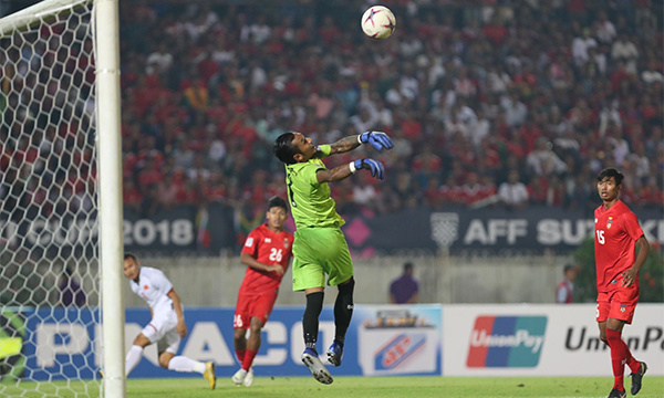 Thủ môn Myanmar đang có một trận đấu xuất sắc khi liên tục cản phá những cơ hội ăn bàn của Việt Nam. Ảnh: Người Đưa Tin |
