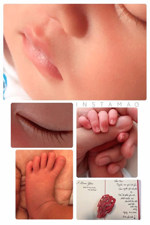 Nữ diễn viên kể lại: "11:30am, đau rồi con à.1 bên máy là tim thai con và 1 bên máy là chỉ số đau khi con gò mẹ. Ui chao,cứ trên 40 là nhói đau trân người rồi mà cô bên cạnh chỉ số còn đến 130. Mẹ nghĩ phải đến ngưỡng đó thì mới sắp được gặp con. Mẹ lại nằm gặm nhắm chờ đợi trong nhưng cơn đau vẫn còn chịu đựng được,co cứng tay chân bấu víu cạnh giường hít vào thở ra để chế ngự không la như mẹ đã từng tuyên bố với chú bác sĩ của mẹ rằng: Con la không biết mắc cỡ đâu! Ấy vậy mà khi sắp được gặp con,mẹ lại thấy sao mẹ trở nên mạnh mẽ bản lĩnh và người lớn vậy cơ chứ".