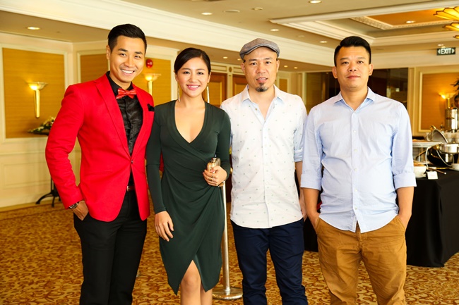 Chị vui vẻ khi gặp lại nhạc sĩ Huy Tuấn, cả hai cùng ngồi ghế giám khảo chương trình Vietnam Idol 2015. |