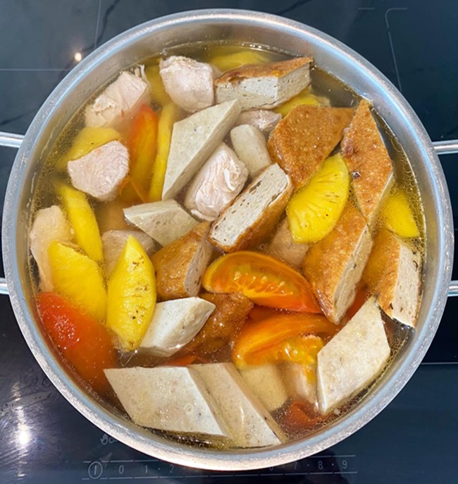 - Sau khi hầm xương xong, cho chả cá, phi-lê cá, thơm, cà chua vào nồi nấu thêm tầm 10 phút. Nêm nếm nước mắm và bột canh theo khẩu vị, có thể cho thêm đường vì nhiều chỗ nấu món này có vị hơi ngọt.