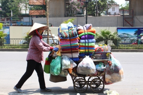 Đẩy xe bán rong trên phố lâu năm, bà Nguyên (quê Hưng Yên) than thở: "Những ngày nóng như thế này đi bán hàng rất vất vả, thứ tưởng bán được như khẩu trang, áo chống nắng nhưng nóng quá không ai ra đường nên cũng chẳng bán được mấy". |