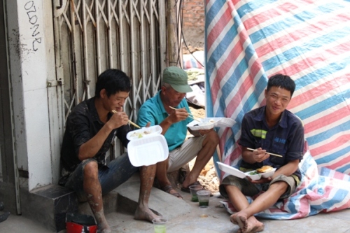 Bữa trưa cơm hộp cùng những nụ cười như thế này khiến các công nhân xây dựng đỡ mệt mỏi hơn, với tiết trời nóng như đổ lửa của Hà Nội. |