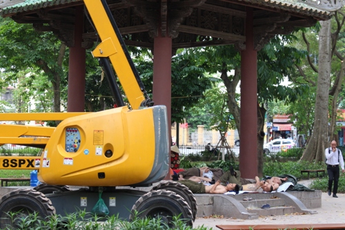 Hơn một tuần trở lại đây, trời Hà Nội như đổ lửa nhưng nhiều người lao động phổ thông vẫn phải căng mình làm việc dưới cái nắng gần 40 độ C.