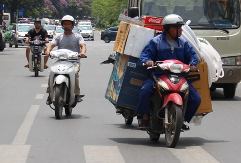 Một người đàn ông này chở dàn điều hòa trên phố Tôn Đức Thắng (Đống Đa) đi lắp đặt cho khách hàng lúc giữa trưa, nắng nóng như thiêu đốt. |