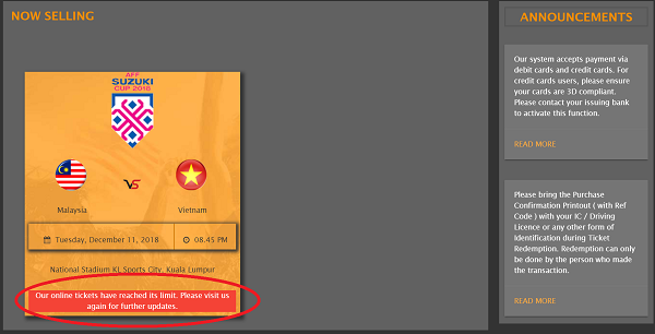 Sáng ngày 7/12, Liên đoàn Bóng đá Quốc gia Malaysia (FAM) đã chính thức mở bán vé cho trận chung kết AFF Suzuki Cup 2018 giữa tuyển Việt Nam và Malaysia diễn ra vào 19h45 phút ngày 11/12 tại sân vận động KL Sport City, thủ đô Kuala Lumpur, Malaysia.