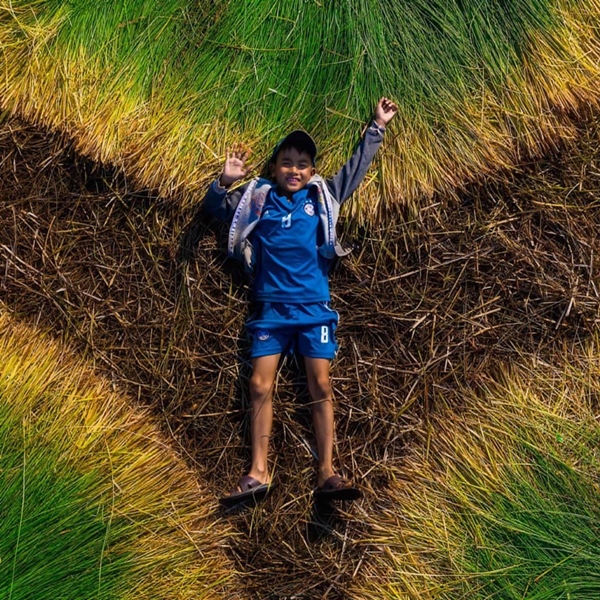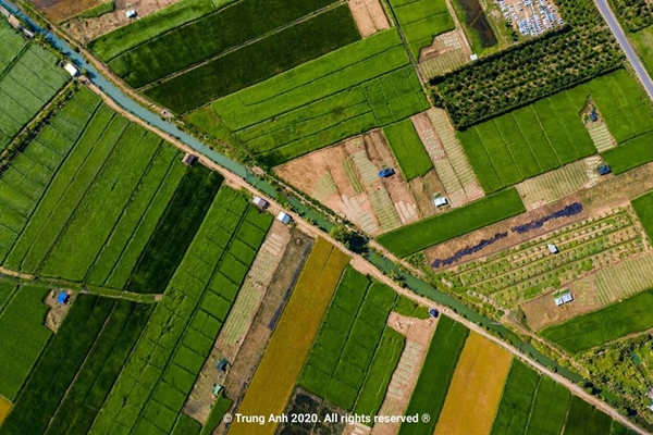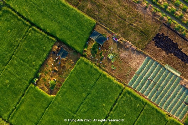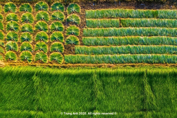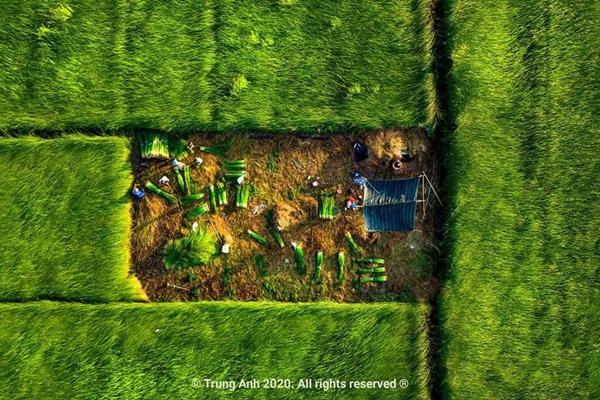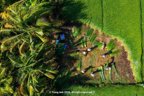 Dưới ống kính của nhiếp ảnh gia, cánh đồng cói vào mùa thu hoạch giống như một bức tranh tuyệt đẹp với màu xanh mướt làm chủ đạo.