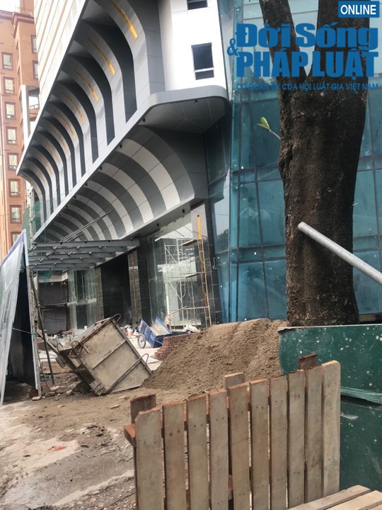 Mặt sau của tòa nhà thì vật liệu xây dựng vứt ngổn ngang. |