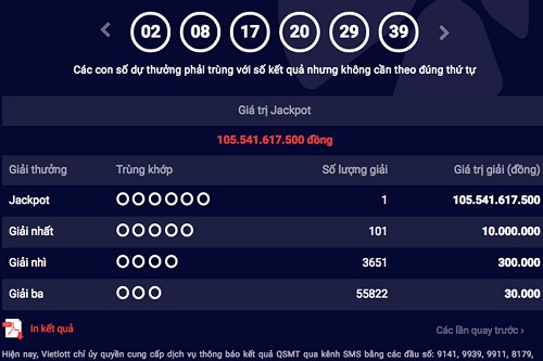 Chiếc vé trúng giải độc đắc trị giá 105,5 tỷ đồng có dãy số may mắn gồm: 02-08-17-20-29-39. Như vậy, người trúng số sẽ phải nộp thuế thu nhập cá nhân trị giá 10% của giải thưởng (khoảng hơn 10,5 tỷ đồng).