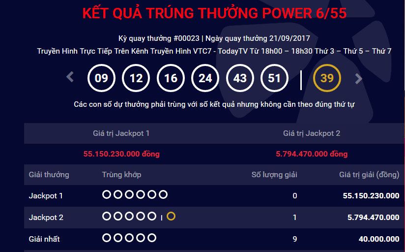 Tại kỳ quay thứ 23 ngày 21/9, Công ty Xổ số điện toán Việt Nam (Vietlott) đã tìm ra vé số trúng giải Jackpot 2 của loại hình xổ số Power 6/55. Chiếc vé số may mắn có 5 trong 6 cặp số thuộc dãy số 09-12-16-24-43-51 và cặp số thứ 6 trùng với số may mắn là 39.