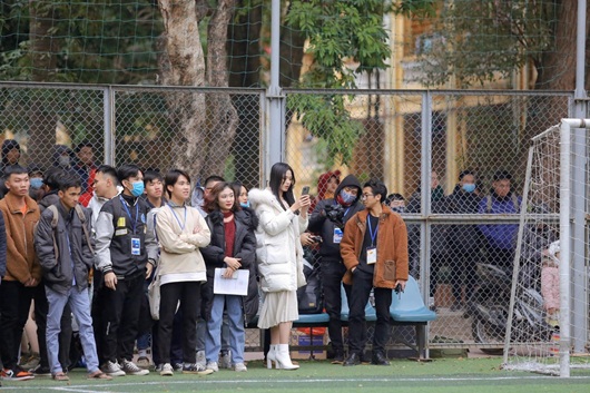 Cùng với các bạn sinh viên khác, Đỗ Thị Hà chăm chú theo dõi diễn biến trận đấu và còn tranh thủ ghi lại nhiều khoảnh khắc trên sân bằng điện thoại. |