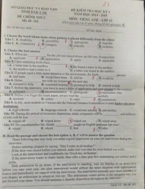 Đề thi tiếng Anh học kỳ I lớp 12 bị lộ ở Đắk Lắk. (Ảnh: Dân trí). |