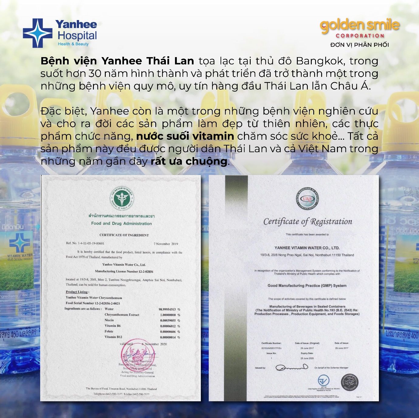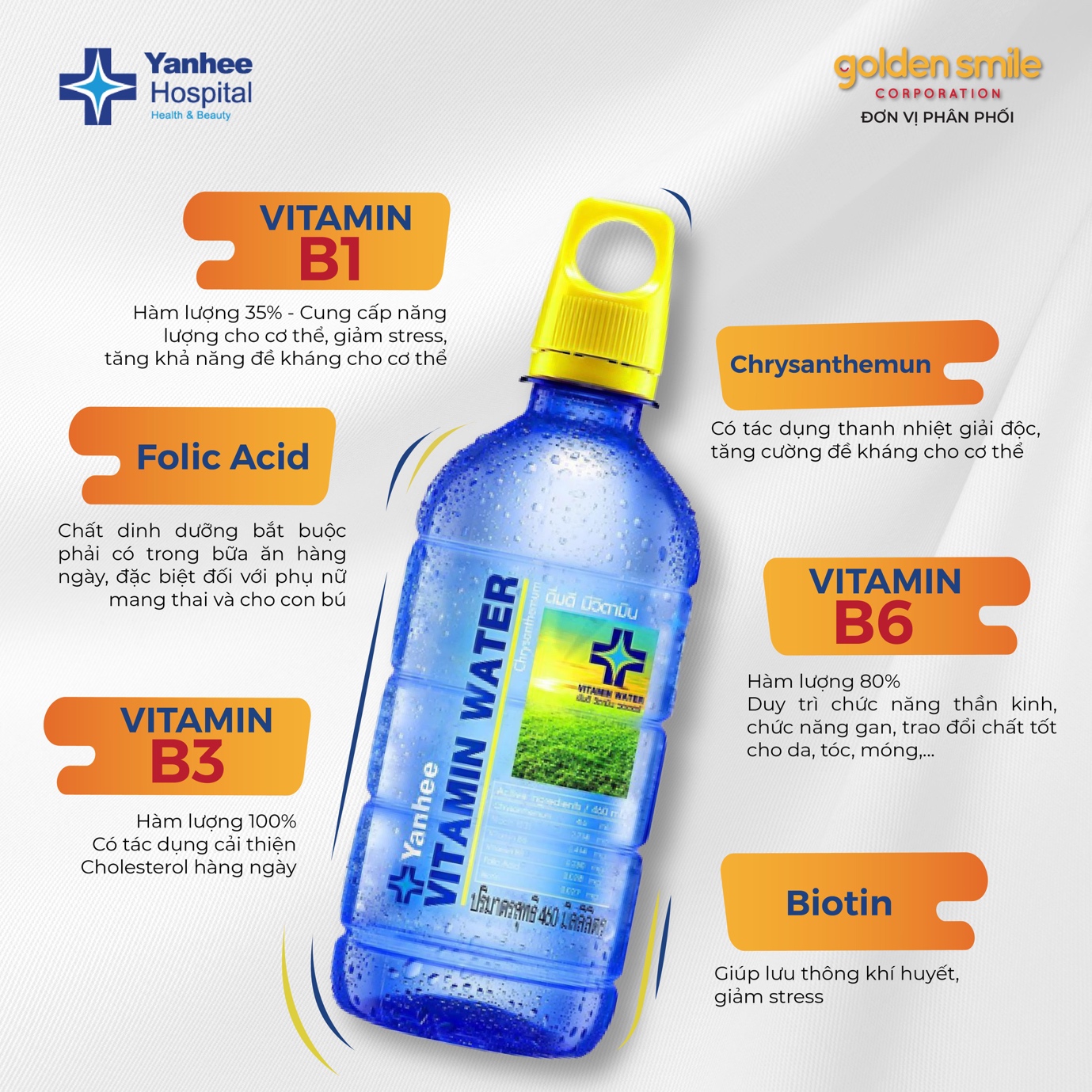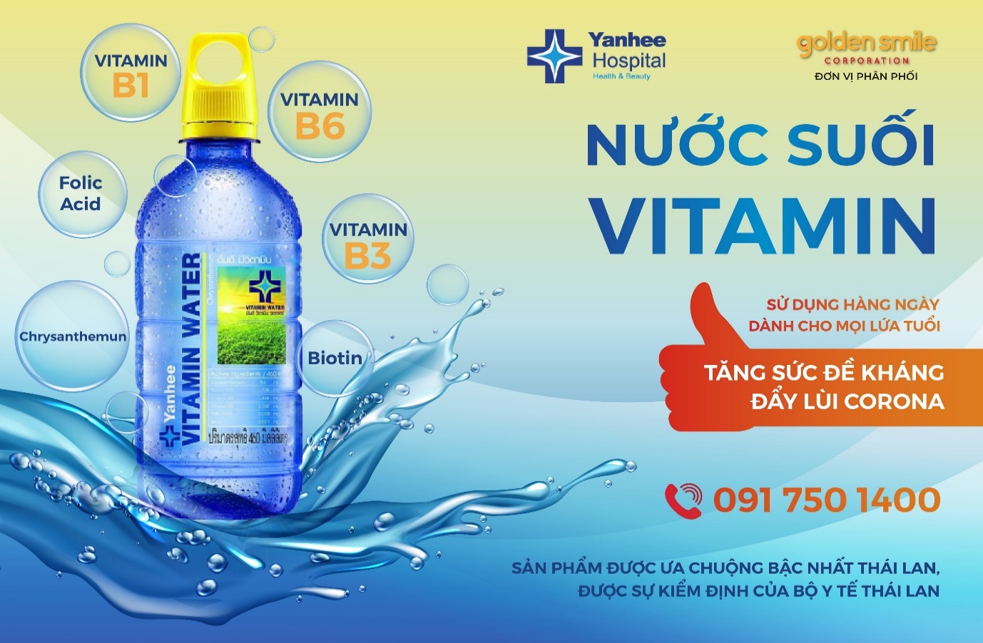 Trên thị trường hiện nay, nước suối vitamin Yanhee là loại nước có chứa các vitamin hoà tan trong nước nói trên, giúp cơ thể tăng cường sức đề kháng, được sản xuất bởi bệnh viện Yanhee Thái Lan. Đây là bệnh viện chăm sóc sắc đẹp nổi tiếng, uy tín hàng đầu Thái Lan lẫn Châu Á, với 30 năm hình thành và phát triển bệnh viện chuyên cho ra đời các sản phẩm làm đẹp từ thiên nhiên, các thực phẩm chức năng… được người dân Thái Lan tin dùng.