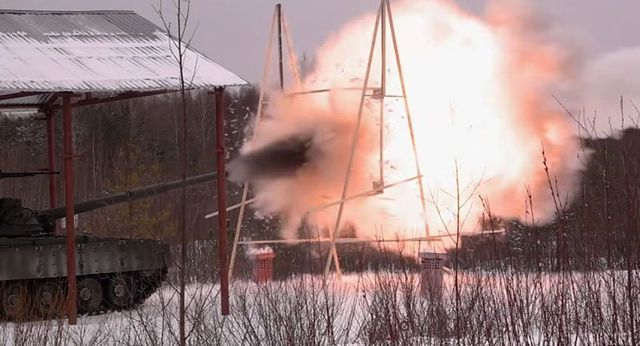Trong đoạn video do kênh truyền hình Zvezda sản xuất và đăng tải, các quân nhân đặt một khối gỗ tròn vào trong nòng súng của xe tăng, sau đó đổ nước vào tháp pháo trước khi bắn ra viên “đạn” đặc biệt.